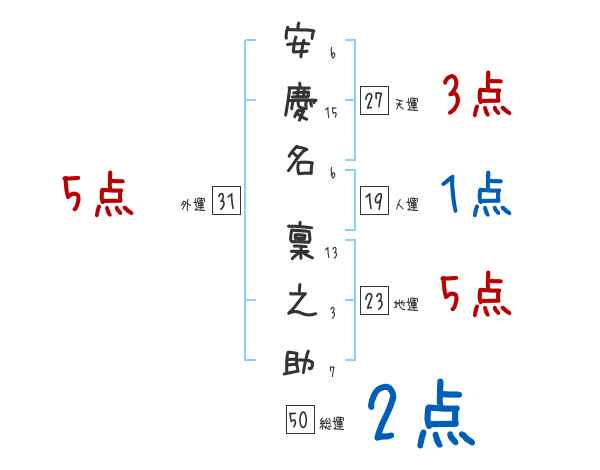 外運![]() | 安慶名稟之助さんの外運は31画の5つ星!社交性があり判断力に優れる。順風満帆な人生で円満な生活。 生活面を象徴する運勢です。外部から受ける影響力を表し、結婚運、家庭運や職場、環境への順応性を表します。 |