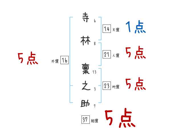 外運![]() | 寺林稟之助さんの外運は16画の5つ星!人望が厚く大きく発展する。逆転成功が見える。 生活面を象徴する運勢です。外部から受ける影響力を表し、結婚運、家庭運や職場、環境への順応性を表します。 |
