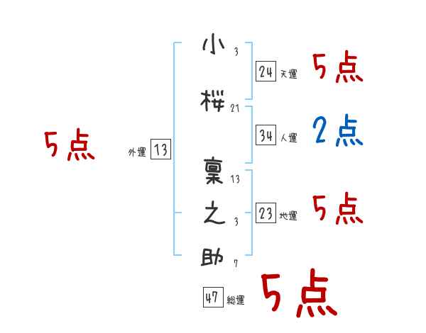 総運![]() | 小桜稟之助さんの総運は47画の5つ星!実力が開花し発展する円満な人生。財に恵まれる。 あなたの人生を表す1番重要な運勢です。生涯を通じて影響する総合運となり、主に50歳以降の晩年期に影響を及ぼします。 |