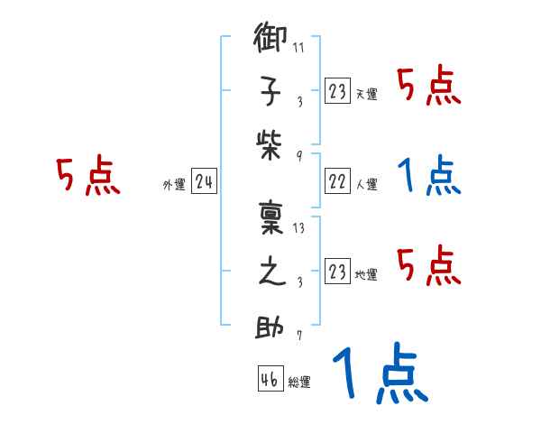 天運![]() | 御子柴稟之助さんの天運は23画の5つ星!想像力に優れ活力がある。一代で成功し名誉を手に入れる。 家系が持つ宿命的な運勢を表します。祖先から受け継いだ苗字ですので自分の力が及びません。家柄を象徴します。 |