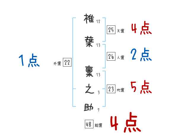 外運![]() | 椎葉稟之助さんの外運は22画の1つ星!努力することが苦手ないっぽう手先が器用。芸術性にも優れる。 生活面を象徴する運勢です。外部から受ける影響力を表し、結婚運、家庭運や職場、環境への順応性を表します。 |