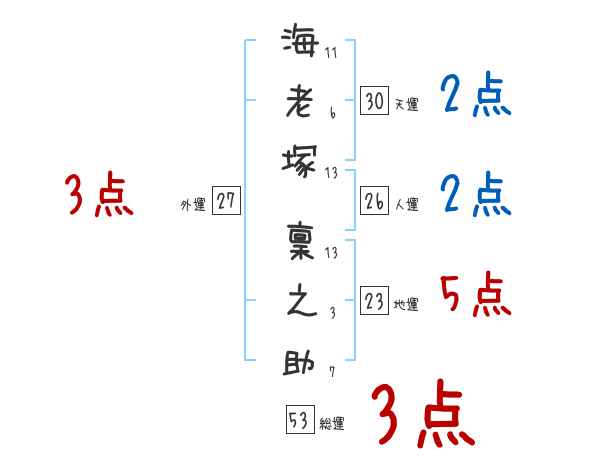 総運![]() | 海老塚稟之助さんの総運は53画の3つ星!やや見栄っ張りで虚栄心がある。散財に注意。 あなたの人生を表す1番重要な運勢です。生涯を通じて影響する総合運となり、主に50歳以降の晩年期に影響を及ぼします。 |