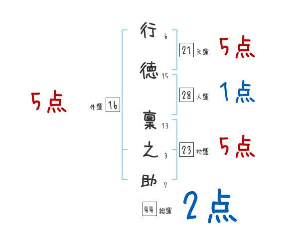 外運![]() | 行徳稟之助さんの外運は16画の5つ星!人望が厚く大きく発展する。逆転成功が見える。 生活面を象徴する運勢です。外部から受ける影響力を表し、結婚運、家庭運や職場、環境への順応性を表します。 |