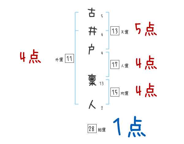 総運![]() | 古井戸稟人さんの総運は28画の1つ星!家庭環境に注意。スポーツで活躍できる能力があるかも。 あなたの人生を表す1番重要な運勢です。生涯を通じて影響する総合運となり、主に50歳以降の晩年期に影響を及ぼします。 |