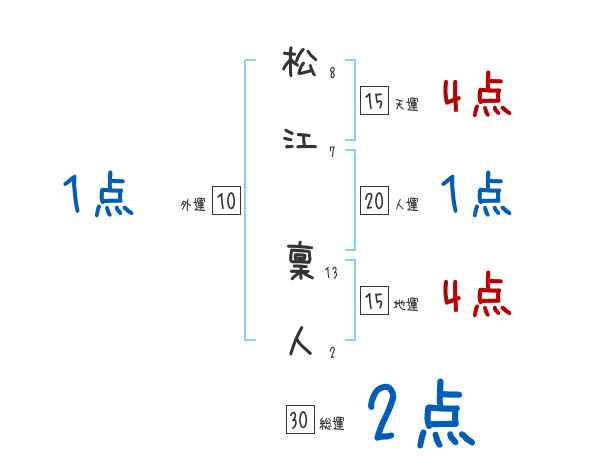 総運![]() | 松江稟人さんの総運は30画の2つ星!浮き沈みの激しさに注意しましょう。 あなたの人生を表す1番重要な運勢です。生涯を通じて影響する総合運となり、主に50歳以降の晩年期に影響を及ぼします。 |
