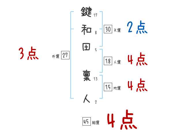 総運![]() | 鍵和田稟人さんの総運は45画の4つ星!もくもくと物事を進め達成する。地味な努力家。 あなたの人生を表す1番重要な運勢です。生涯を通じて影響する総合運となり、主に50歳以降の晩年期に影響を及ぼします。 |