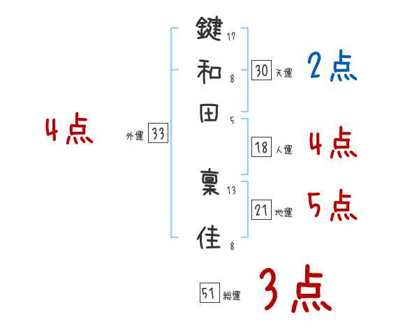 外運![]() | 鍵和田稟佳さんの外運は33画の4つ星!権力志向でプライドが高い。勇気があり運を切り開き成功する。 生活面を象徴する運勢です。外部から受ける影響力を表し、結婚運、家庭運や職場、環境への順応性を表します。 |
