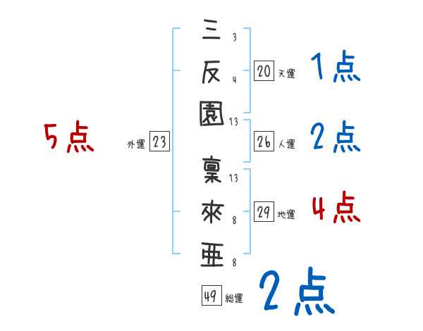 外運![]() | 三反園稟來亜さんの外運は23画の5つ星!想像力に優れ活力がある。一代で成功し名誉を手に入れる。 生活面を象徴する運勢です。外部から受ける影響力を表し、結婚運、家庭運や職場、環境への順応性を表します。 |