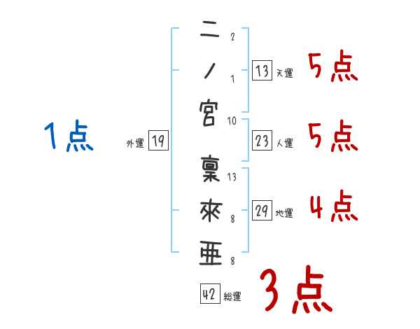 天運![]() | 二ノ宮稟來亜さんの天運は13画の5つ星!才能に恵まれ人気がある。名声を手に入れる。円満な人生。 家系が持つ宿命的な運勢を表します。祖先から受け継いだ苗字ですので自分の力が及びません。家柄を象徴します。 |