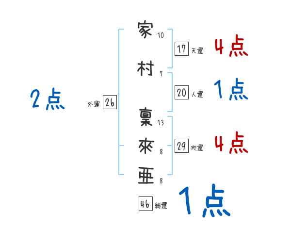 天運![]() | 家村稟來亜さんの天運は17画の4つ星!積極的な行動力。地位を気づき財産を手に入れる。純粋な心と直感力。 家系が持つ宿命的な運勢を表します。祖先から受け継いだ苗字ですので自分の力が及びません。家柄を象徴します。 |
