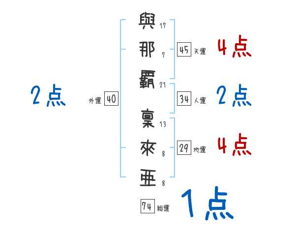 天運![]() | 與那覇稟來亜さんの天運は45画の4つ星!もくもくと物事を進め達成する。地味な努力家。 家系が持つ宿命的な運勢を表します。祖先から受け継いだ苗字ですので自分の力が及びません。家柄を象徴します。 |