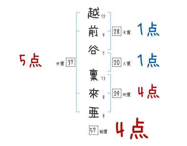 総運![]() | 越前谷稟來亜さんの総運は57画の4つ星!向上心があり人望がある。地位を得る。 あなたの人生を表す1番重要な運勢です。生涯を通じて影響する総合運となり、主に50歳以降の晩年期に影響を及ぼします。 |