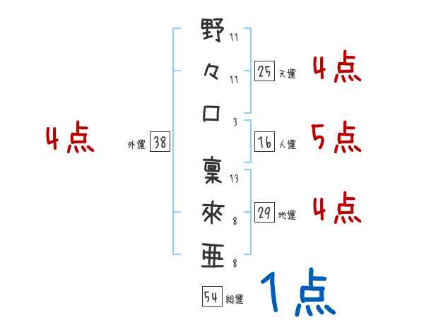 人運![]() | 野々口稟來亜さんの人運は16画の5つ星!人望が厚く大きく発展する。逆転成功が見える。 性格や才能などを表す2番目に重要な運勢です。人間関係や協調性、社会的な成功に影響します。主に20歳から50歳ぐらいまでの中年期の運勢を表します。 |