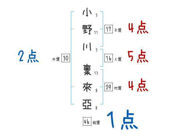 総運![]() | 小野川稟來亞さんの総運は46画の1つ星!迷走することが多く苦労するかも。目先のことにとらわれないように。 あなたの人生を表す1番重要な運勢です。生涯を通じて影響する総合運となり、主に50歳以降の晩年期に影響を及ぼします。 |
