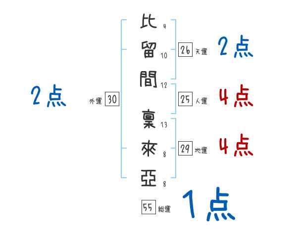 天運![]() | 比留間稟來亞さんの天運は26画の2つ星!波瀾万丈かも。信頼できる人を大事にしましょう。 家系が持つ宿命的な運勢を表します。祖先から受け継いだ苗字ですので自分の力が及びません。家柄を象徴します。 |