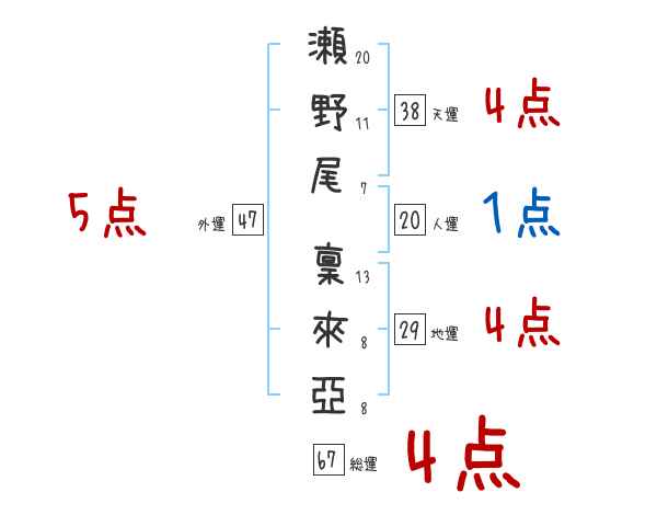 外運![]() | 瀬野尾稟來亞さんの外運は47画の5つ星!実力が開花し発展する円満な人生。財に恵まれる。 生活面を象徴する運勢です。外部から受ける影響力を表し、結婚運、家庭運や職場、環境への順応性を表します。 |