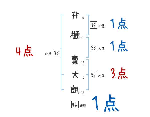 天運![]() | 井樋稟大朗さんの天運は19画の1つ星!優れた才能を持ちますが、協調性が足りないことも。周りの人と協力する事を意識しましょう。 家系が持つ宿命的な運勢を表します。祖先から受け継いだ苗字ですので自分の力が及びません。家柄を象徴します。 |