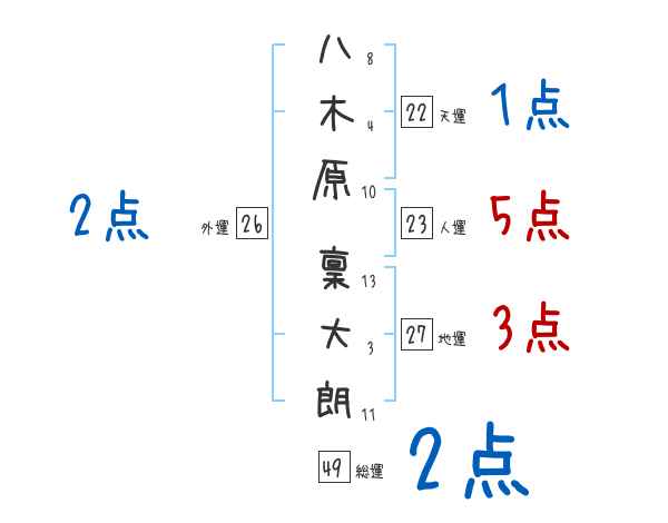 外運![]() | 八木原稟大朗さんの外運は26画の2つ星!波瀾万丈かも。信頼できる人を大事にしましょう。 生活面を象徴する運勢です。外部から受ける影響力を表し、結婚運、家庭運や職場、環境への順応性を表します。 |