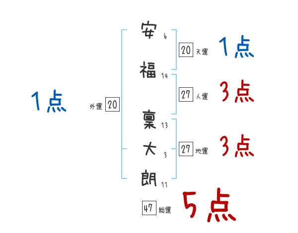 総運![]() | 安福稟大朗さんの総運は47画の5つ星!実力が開花し発展する円満な人生。財に恵まれる。 あなたの人生を表す1番重要な運勢です。生涯を通じて影響する総合運となり、主に50歳以降の晩年期に影響を及ぼします。 |
