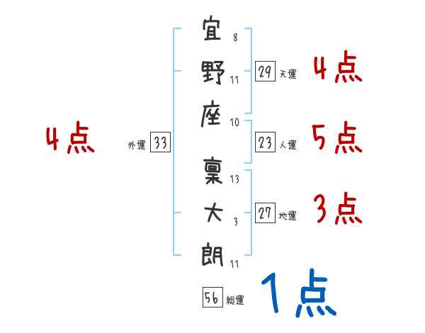 外運![]() | 宜野座稟大朗さんの外運は33画の4つ星!権力志向でプライドが高い。勇気があり運を切り開き成功する。 生活面を象徴する運勢です。外部から受ける影響力を表し、結婚運、家庭運や職場、環境への順応性を表します。 |
