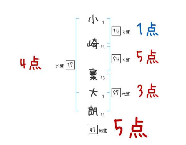 外運![]() | 小崎稟大朗さんの外運は17画の4つ星!積極的な行動力。地位を気づき財産を手に入れる。純粋な心と直感力。 生活面を象徴する運勢です。外部から受ける影響力を表し、結婚運、家庭運や職場、環境への順応性を表します。 |