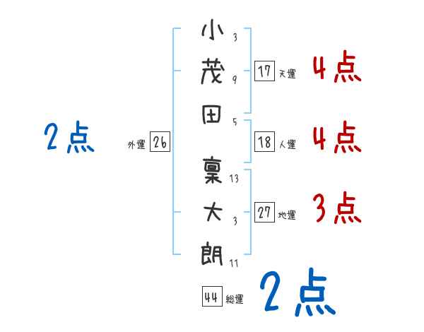 総運![]() | 小茂田稟大朗さんの総運は44画の2つ星!誠実で慎重な性格。物事を考えすぎないように注意しましょう。 あなたの人生を表す1番重要な運勢です。生涯を通じて影響する総合運となり、主に50歳以降の晩年期に影響を及ぼします。 |