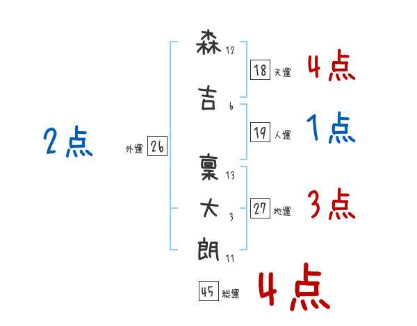 総運![]() | 森吉稟大朗さんの総運は45画の4つ星!もくもくと物事を進め達成する。地味な努力家。 あなたの人生を表す1番重要な運勢です。生涯を通じて影響する総合運となり、主に50歳以降の晩年期に影響を及ぼします。 |