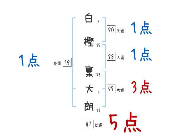 総運![]() | 白樫稟大朗さんの総運は47画の5つ星!実力が開花し発展する円満な人生。財に恵まれる。 あなたの人生を表す1番重要な運勢です。生涯を通じて影響する総合運となり、主に50歳以降の晩年期に影響を及ぼします。 |
