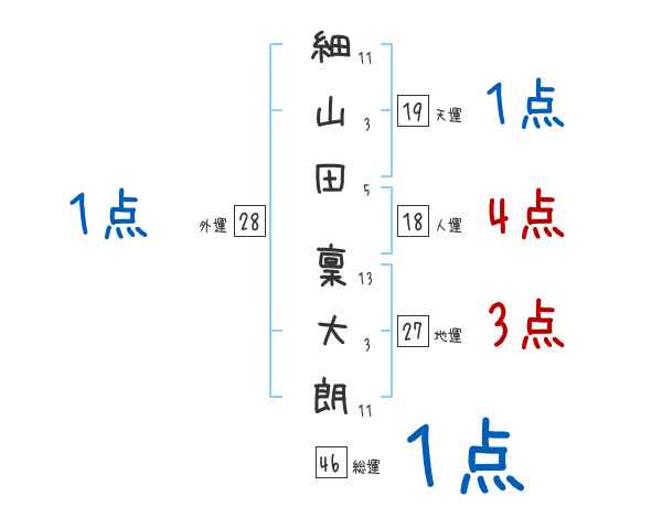 総運![]() | 細山田稟大朗さんの総運は46画の1つ星!迷走することが多く苦労するかも。目先のことにとらわれないように。 あなたの人生を表す1番重要な運勢です。生涯を通じて影響する総合運となり、主に50歳以降の晩年期に影響を及ぼします。 |