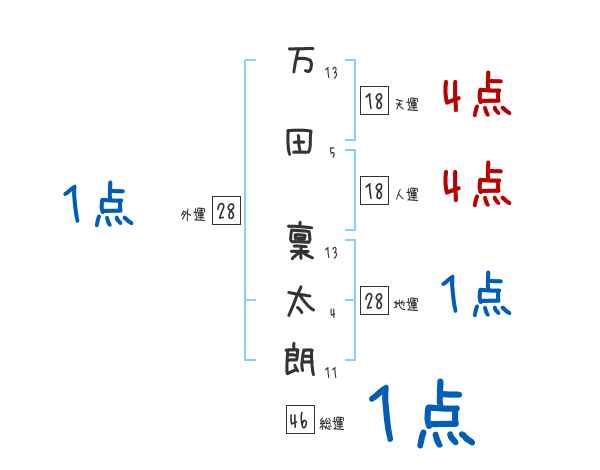 総運![]() | 万田稟太朗さんの総運は46画の1つ星!迷走することが多く苦労するかも。目先のことにとらわれないように。 あなたの人生を表す1番重要な運勢です。生涯を通じて影響する総合運となり、主に50歳以降の晩年期に影響を及ぼします。 |