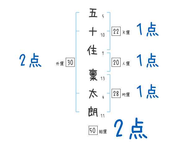 総運![]() | 五十住稟太朗さんの総運は50画の2つ星!浮き沈みが激しく不安定。しりすぼみに衰退しやすいので注意しましょう。 あなたの人生を表す1番重要な運勢です。生涯を通じて影響する総合運となり、主に50歳以降の晩年期に影響を及ぼします。 |