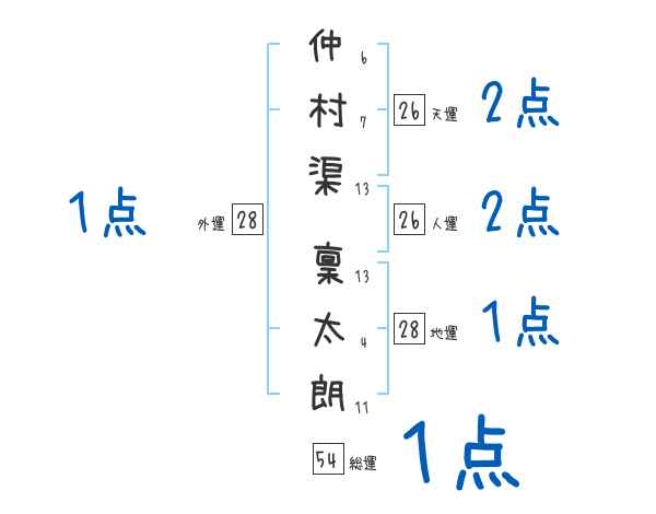 天運![]() | 仲村渠稟太朗さんの天運は26画の2つ星!波瀾万丈かも。信頼できる人を大事にしましょう。 家系が持つ宿命的な運勢を表します。祖先から受け継いだ苗字ですので自分の力が及びません。家柄を象徴します。 |