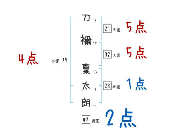 人運![]() | 刀禰稟太朗さんの人運は32画の5つ星!柔軟性があり成功する。チャンスが多く金運が良い。 性格や才能などを表す2番目に重要な運勢です。人間関係や協調性、社会的な成功に影響します。主に20歳から50歳ぐらいまでの中年期の運勢を表します。 |