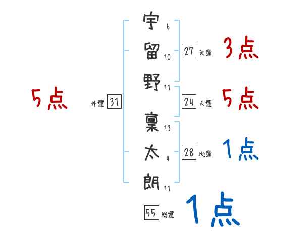 総運![]() | 宇留野稟太朗さんの総運は55画の1つ星!欲張りな性格で軽率な行動に注意しましょう。病気に気をつけて。 あなたの人生を表す1番重要な運勢です。生涯を通じて影響する総合運となり、主に50歳以降の晩年期に影響を及ぼします。 |