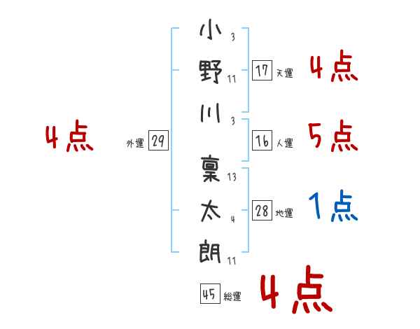 天運![]() | 小野川稟太朗さんの天運は17画の4つ星!積極的な行動力。地位を気づき財産を手に入れる。純粋な心と直感力。 家系が持つ宿命的な運勢を表します。祖先から受け継いだ苗字ですので自分の力が及びません。家柄を象徴します。 |