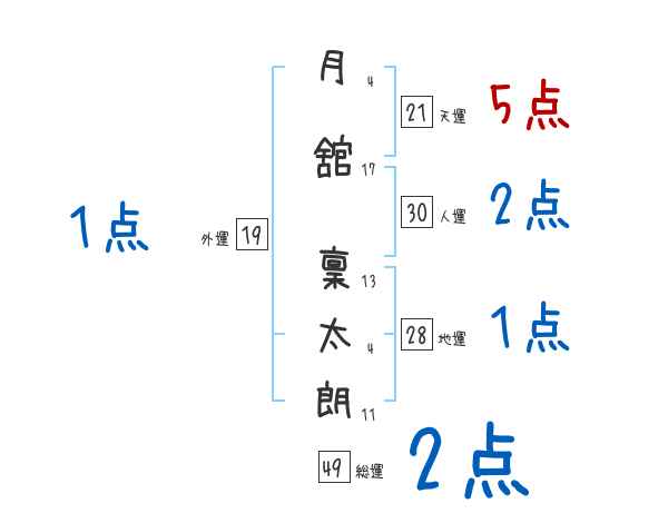 天運![]() | 月舘稟太朗さんの天運は21画の5つ星!統率力がある。独立し成功する。名誉を手に入れる。 家系が持つ宿命的な運勢を表します。祖先から受け継いだ苗字ですので自分の力が及びません。家柄を象徴します。 |