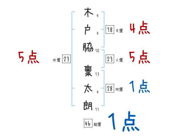 人運![]() | 木戸脇稟太朗さんの人運は23画の5つ星!想像力に優れ活力がある。一代で成功し名誉を手に入れる。 性格や才能などを表す2番目に重要な運勢です。人間関係や協調性、社会的な成功に影響します。主に20歳から50歳ぐらいまでの中年期の運勢を表します。 |