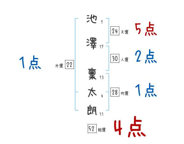 外運![]() | 池澤稟太朗さんの外運は22画の1つ星!努力することが苦手ないっぽう手先が器用。芸術性にも優れる。 生活面を象徴する運勢です。外部から受ける影響力を表し、結婚運、家庭運や職場、環境への順応性を表します。 |