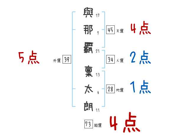 外運![]() | 與那覇稟太朗さんの外運は39画の5つ星!社交性に優れ人望が厚い。人の上に立ち成功する。 生活面を象徴する運勢です。外部から受ける影響力を表し、結婚運、家庭運や職場、環境への順応性を表します。 |