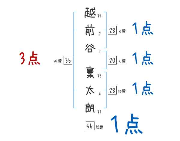 外運![]() | 越前谷稟太朗さんの外運は36画の3つ星!先見性が豊かです。多少神経質で苦労することも。 生活面を象徴する運勢です。外部から受ける影響力を表し、結婚運、家庭運や職場、環境への順応性を表します。 |