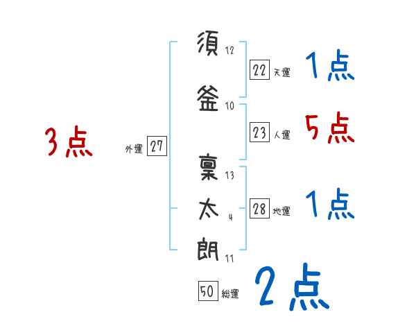 外運![]() | 須釜稟太朗さんの外運は27画の3つ星!頭脳明晰だが強情で摩擦が多い傾向。孤立に注意。 生活面を象徴する運勢です。外部から受ける影響力を表し、結婚運、家庭運や職場、環境への順応性を表します。 |