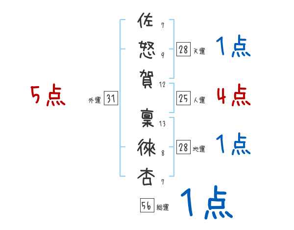 佐怒賀稟徠杏さんの外運は31画の5つ星