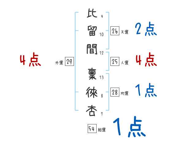地運![]() | 比留間稟徠杏さんの地運は28画の1つ星!家庭環境に注意。スポーツで活躍できる能力があるかも。 個性を表す基礎的な運勢です。性格形成や対人関係、行動力など家庭環境に影響されます。主に誕生してから20歳くらいまでの若年期の運勢を表します。 |