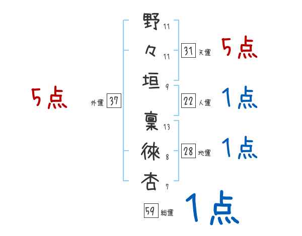 人運![]() | 野々垣稟徠杏さんの人運は22画の1つ星!努力することが苦手ないっぽう手先が器用。芸術性にも優れる。 性格や才能などを表す2番目に重要な運勢です。人間関係や協調性、社会的な成功に影響します。主に20歳から50歳ぐらいまでの中年期の運勢を表します。 |