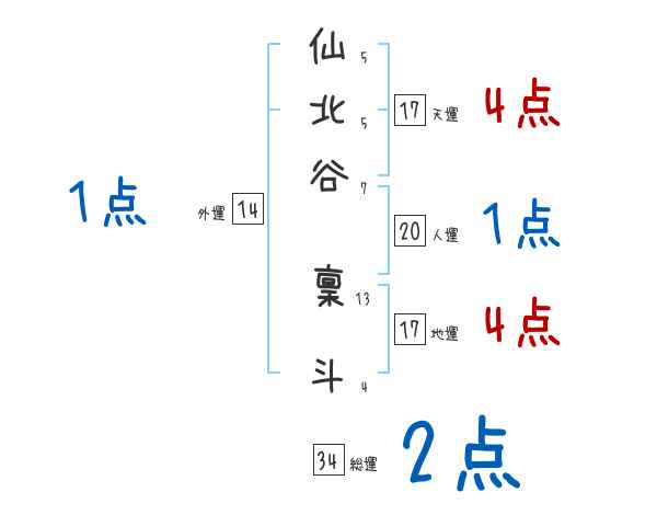 総運![]() | 仙北谷稟斗さんの総運は34画の2つ星!独創性に優れるが、自尊心が強く災難に注意しましょう。 あなたの人生を表す1番重要な運勢です。生涯を通じて影響する総合運となり、主に50歳以降の晩年期に影響を及ぼします。 |