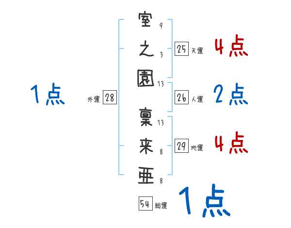 天運![]() | 室之園稟来亜さんの天運は25画の4つ星!個性があり才能があふれる。強運の持ち主で発展する。 家系が持つ宿命的な運勢を表します。祖先から受け継いだ苗字ですので自分の力が及びません。家柄を象徴します。 |