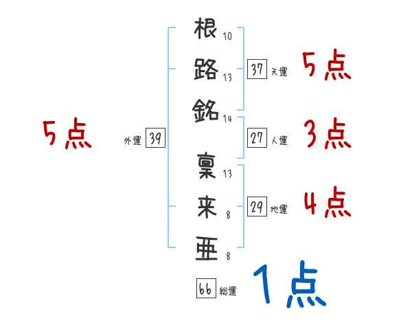 外運![]() | 根路銘稟来亜さんの外運は39画の5つ星!社交性に優れ人望が厚い。人の上に立ち成功する。 生活面を象徴する運勢です。外部から受ける影響力を表し、結婚運、家庭運や職場、環境への順応性を表します。 |
