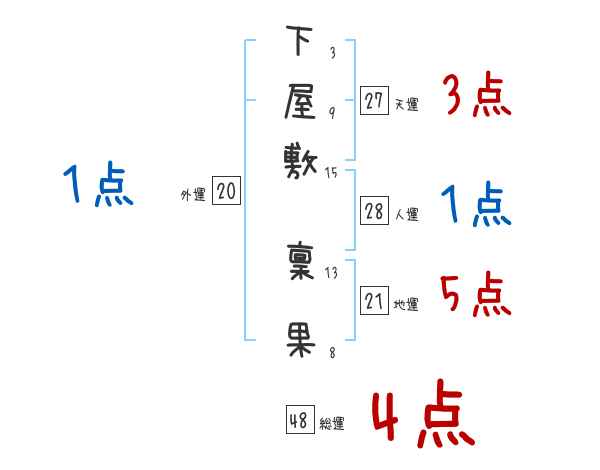 天運![]() | 下屋敷稟果さんの天運は27画の3つ星!頭脳明晰だが強情で摩擦が多い傾向。孤立に注意。 家系が持つ宿命的な運勢を表します。祖先から受け継いだ苗字ですので自分の力が及びません。家柄を象徴します。 |