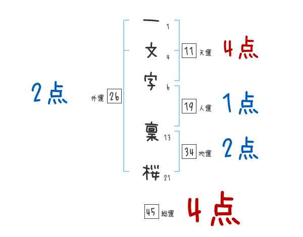 人運![]() | 一文字稟桜さんの人運は19画の1つ星!優れた才能を持ちますが、協調性が足りないことも。周りの人と協力する事を意識しましょう。 性格や才能などを表す2番目に重要な運勢です。人間関係や協調性、社会的な成功に影響します。主に20歳から50歳ぐらいまでの中年期の運勢を表します。 |