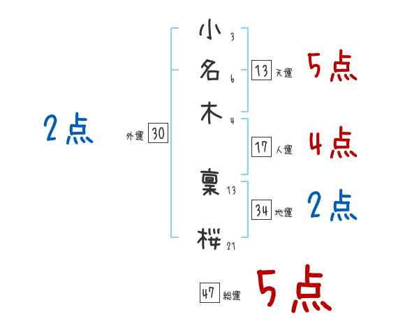 総運![]() | 小名木稟桜さんの総運は47画の5つ星!実力が開花し発展する円満な人生。財に恵まれる。 あなたの人生を表す1番重要な運勢です。生涯を通じて影響する総合運となり、主に50歳以降の晩年期に影響を及ぼします。 |
